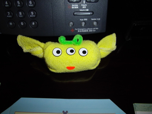 電話の前にちょこんといらっしゃったリトルグリーンメンさん。