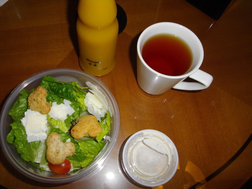 ホテル内ハリウッド&ダインで購入したシーザーサラダとマンゴージュース。
